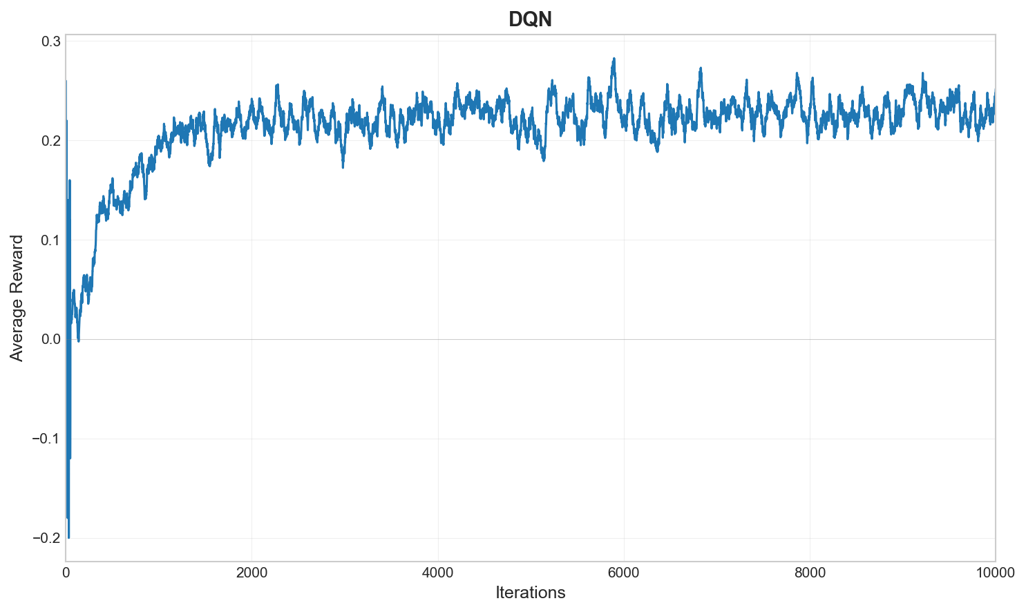 In standard DQN, the maximisation in \(y_t\) can introduce positive bias (“overestimation”). We therefore use the Double DQN decomposition, selecting the greedy action under the online network but evaluating it with the target network (Hasselt et al. 2016): \[\begin{equation} y_t^{\mathrm{DDQN}} \;=\; r_{t+1} + \gamma\,Q\Bigl(s_{t+1},\arg\max_{a'}Q(s_{t+1},a';\theta);\theta^{-}\Bigr). \end{equation}\]