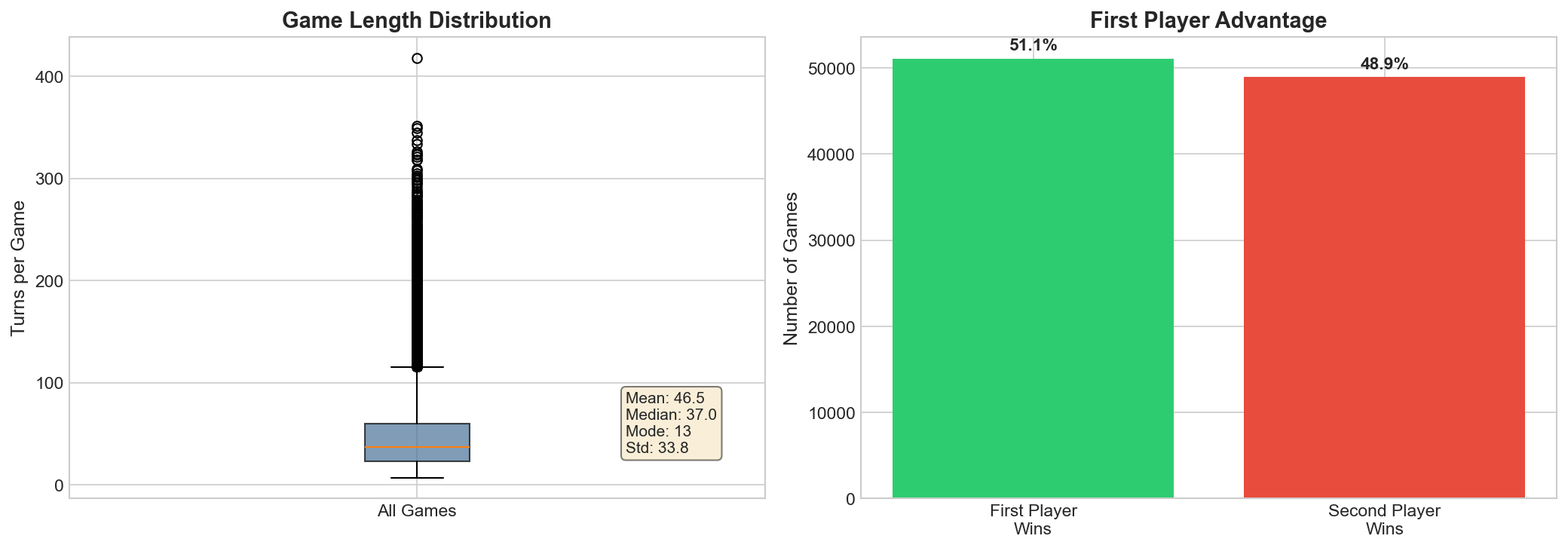 We observe a modest first-player advantage: first player wins 51.07% of games (51,068 / 100,000).